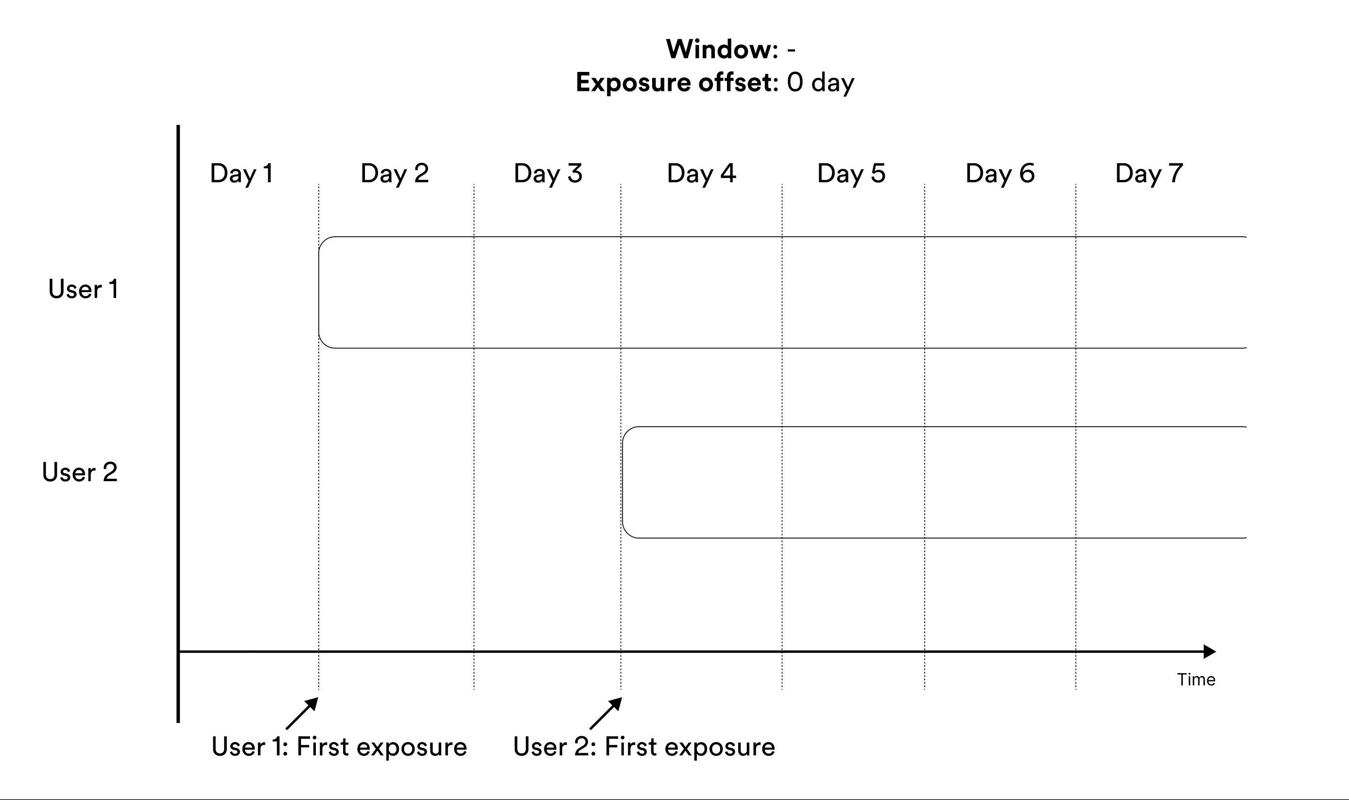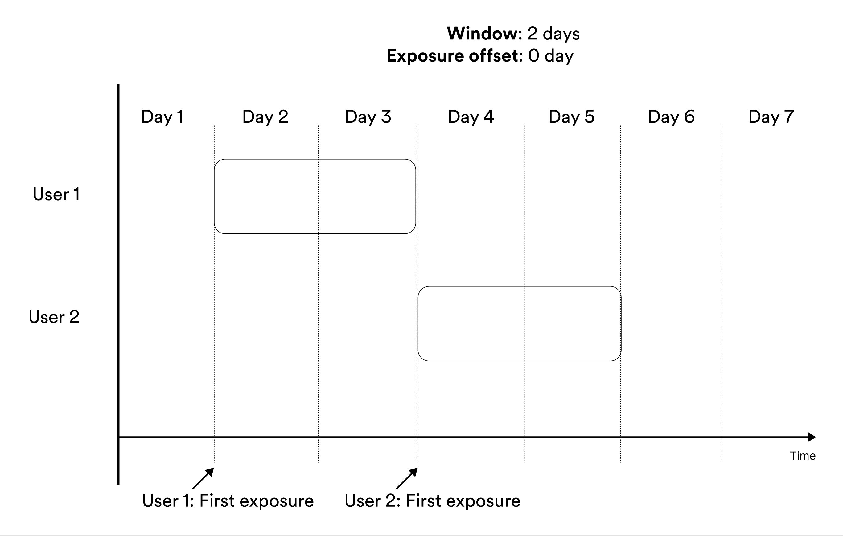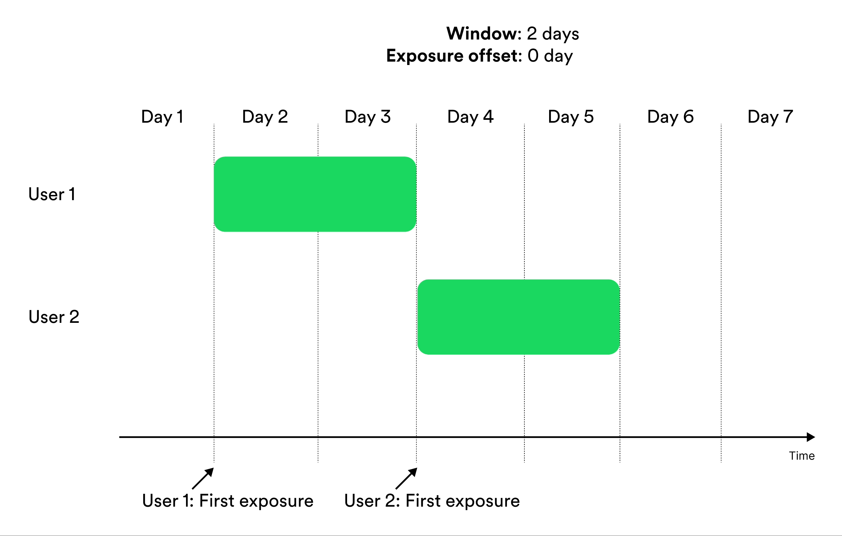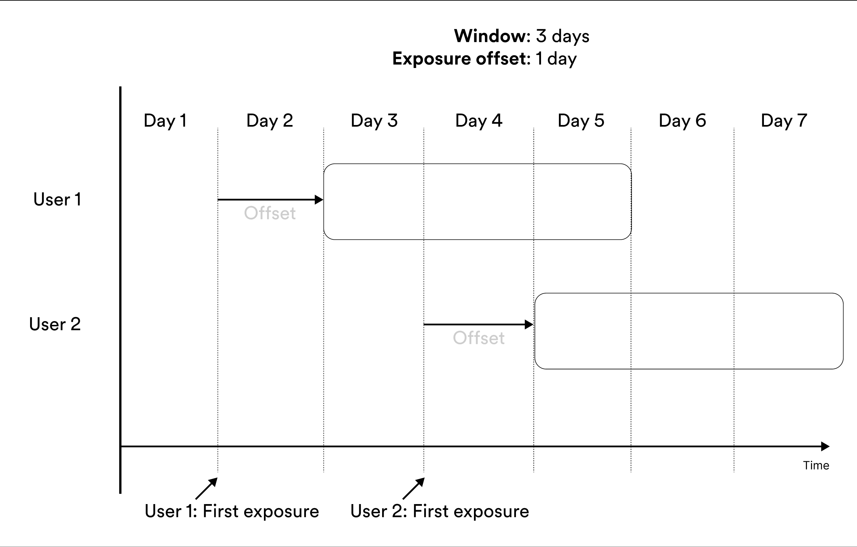 Window-based metrics measure behavior over a time window, where time is relative to exposure. To define a window-based metric you need to specify an exposure offset and an aggregation window. These parameters specify when the aggregation of data should start relative to exposure, and for how long the aggregation should be applied. Illustration of exposure offset and windows in metrics.